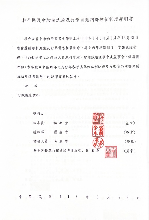 臺中市和平區農會內部控制聲明書