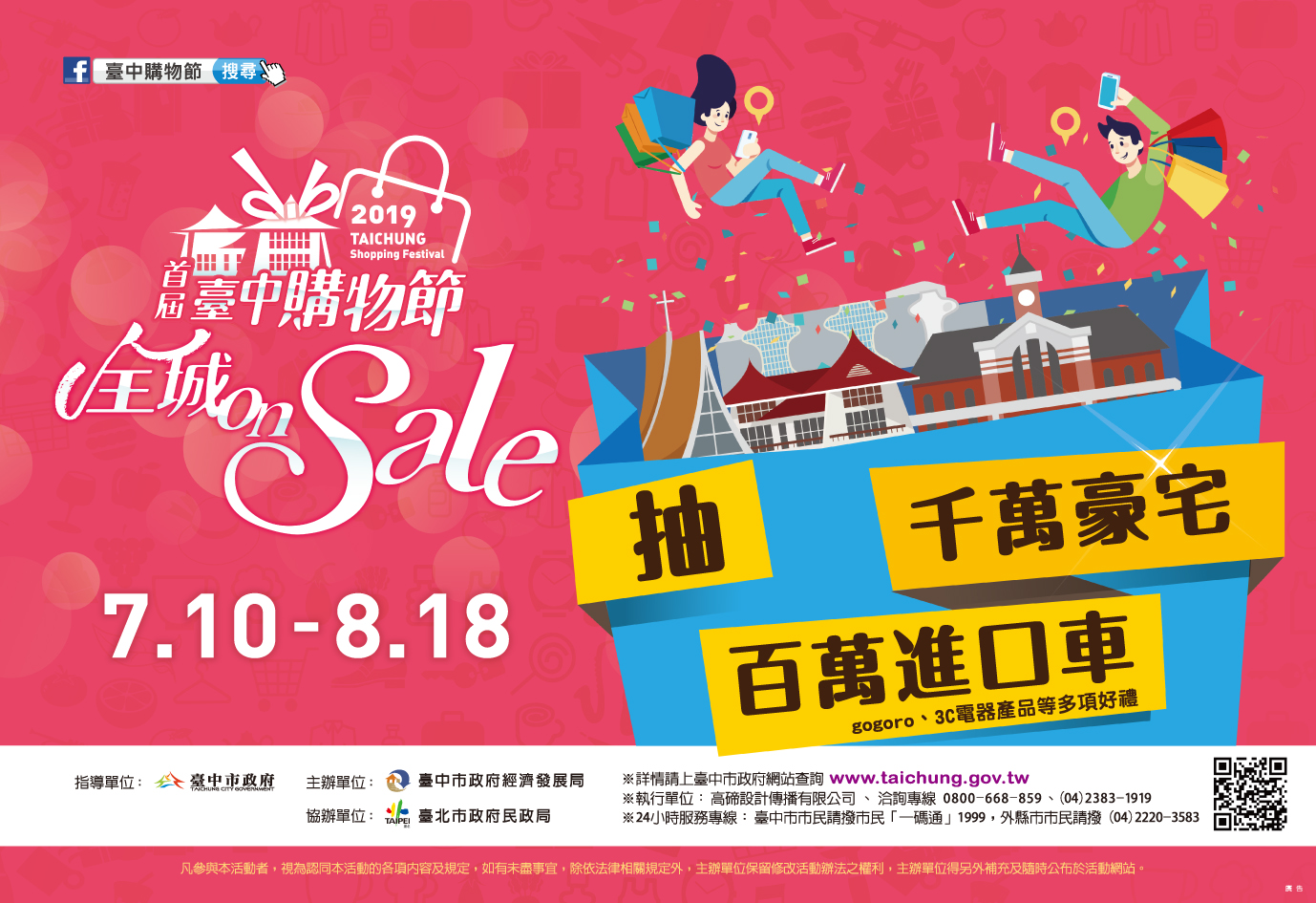 隆重登場,購物節期間至臺中購物500元並上網登錄發票,即可參與抽獎,有機會抽中價值千萬的精品豪宅、5台汽車、6間總統套房住宿、6台時尚電動機車,以及飯店旅宿、精美伴手禮等大獎,週週大折扣,歡迎一同共襄盛舉。