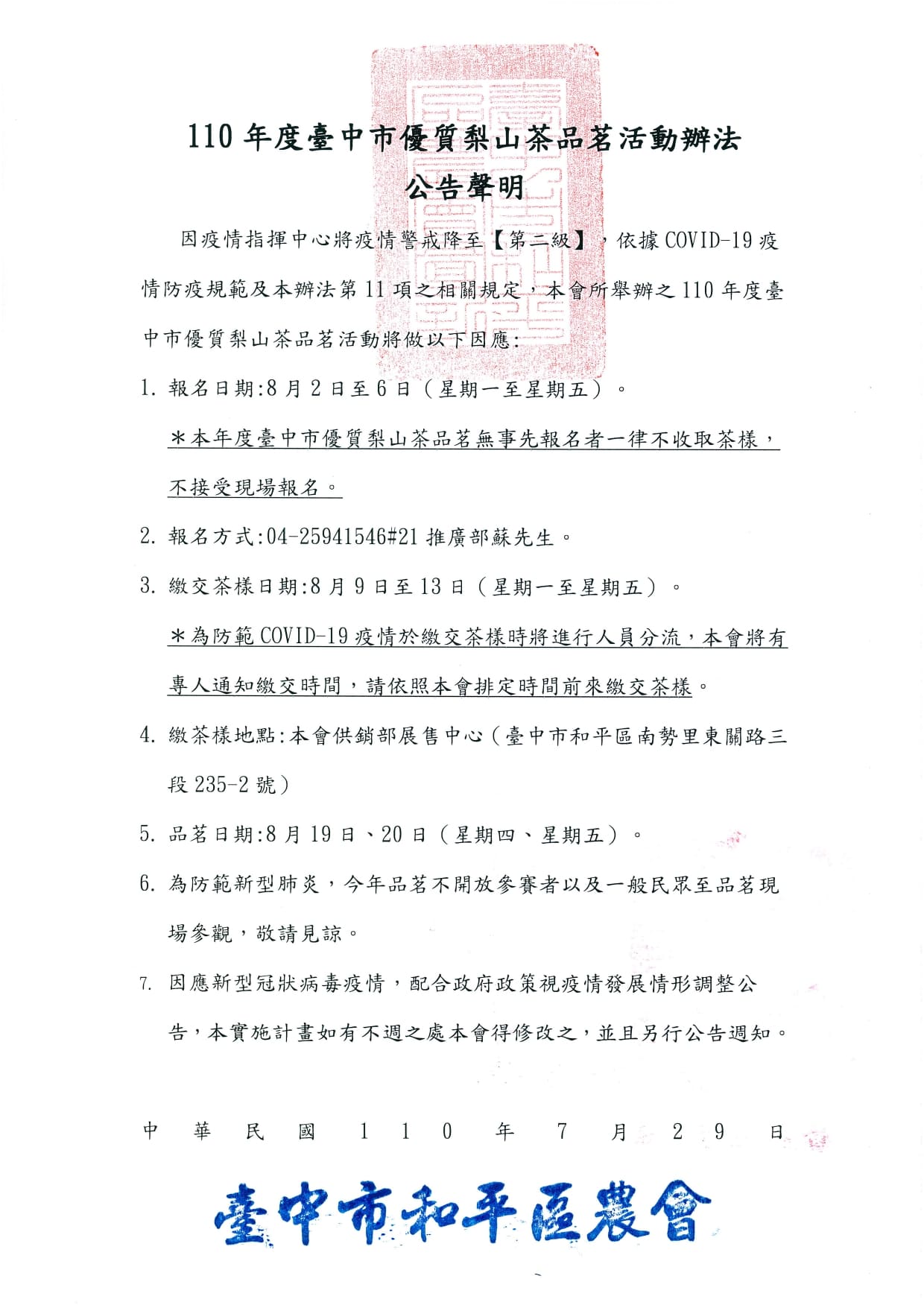 *為防範COVID-19疫情於繳交茶樣時將進行人員分流,本會將有專人通知繳交時間,請依照本會排定時間前來繳交茶樣。