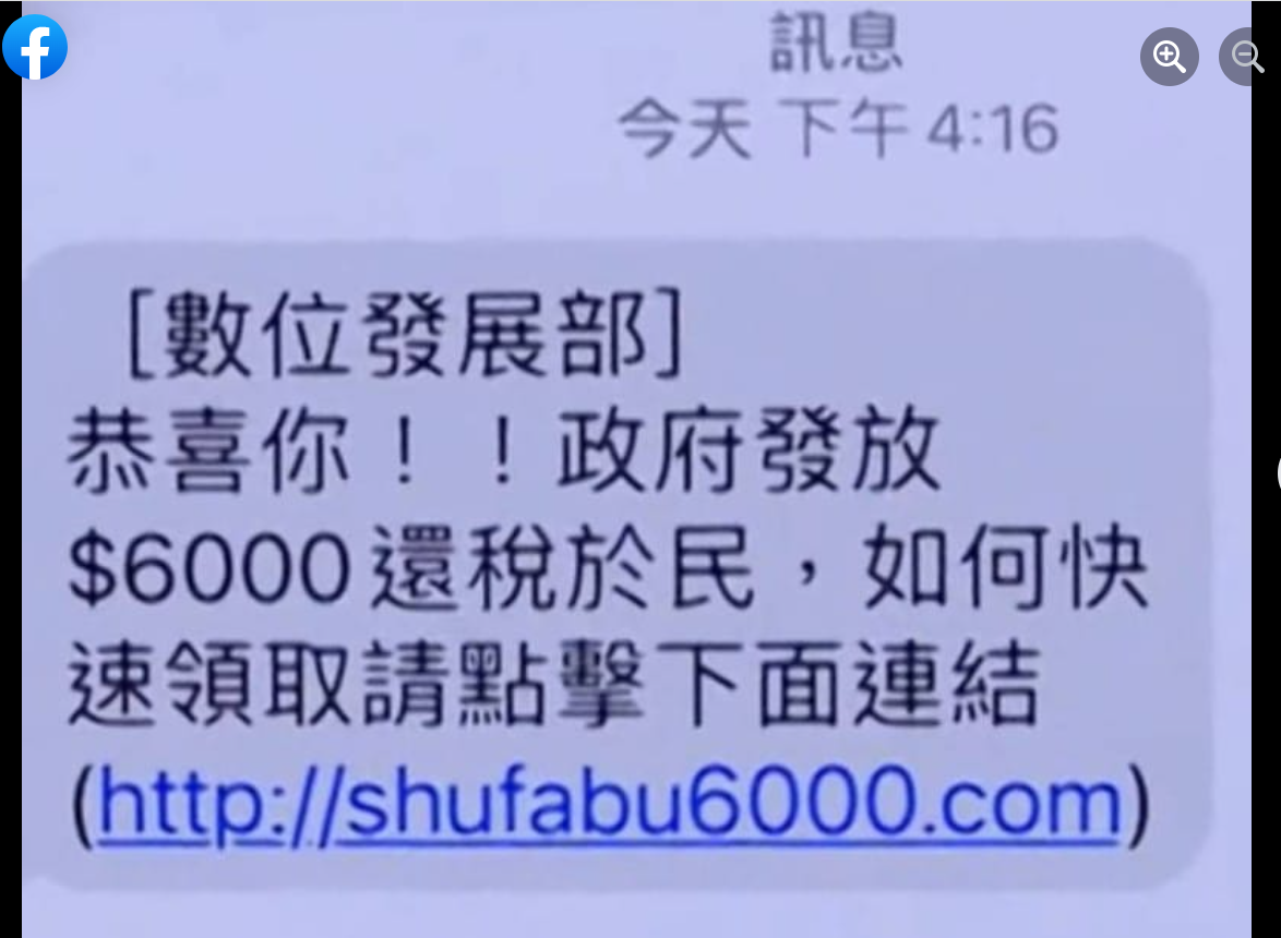 記住,政府不會發送手機簡訊,也不會發送Email電子郵件,通知領取普發現金的相關消息。下圖即為詐騙簡訊。